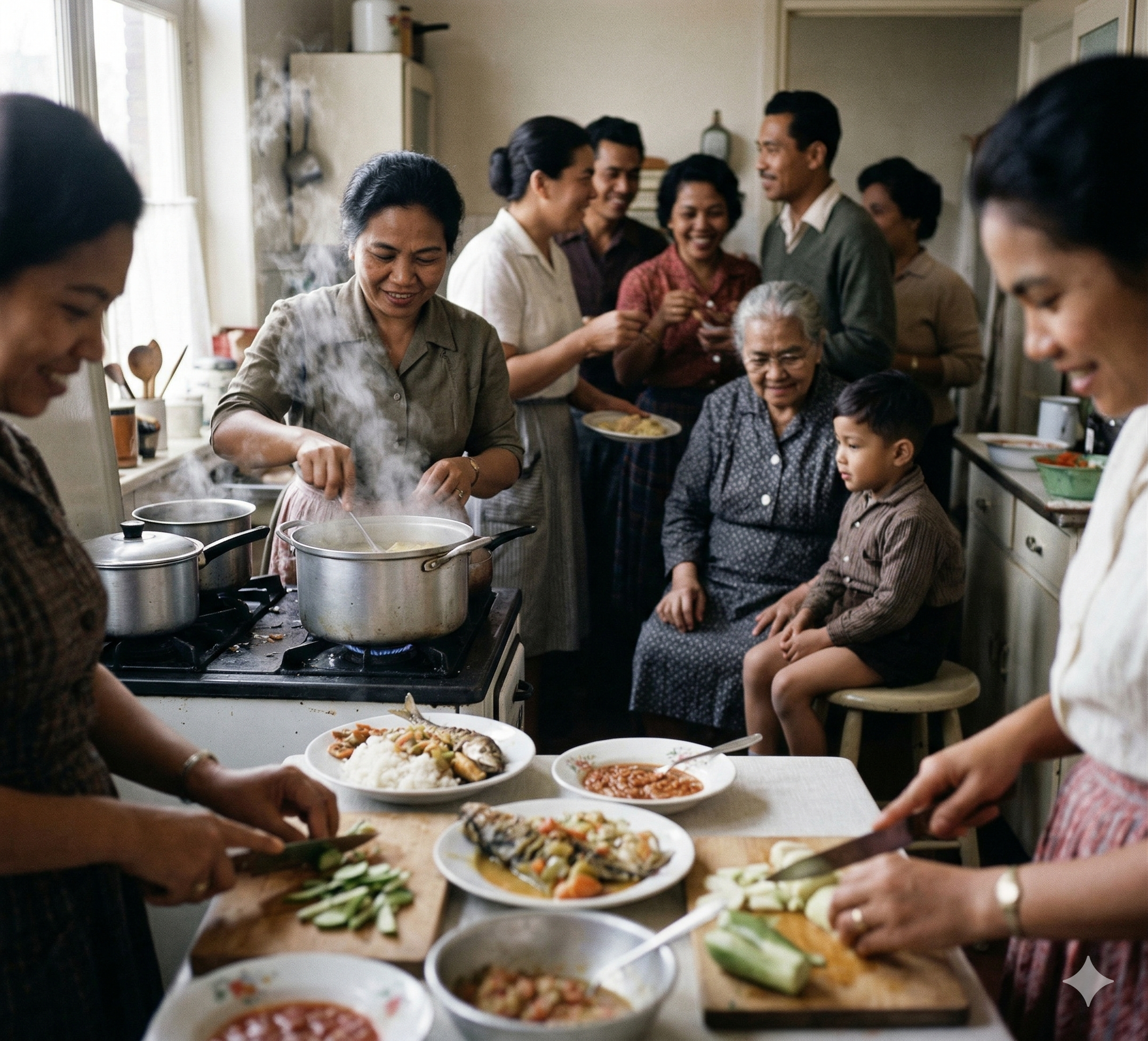 Voor veel van onze tantes begint het verhaal van Moluks eten niet in een restaurant of kookboek, maar gewoon … thuis. In de keuken waar hun moeder, oma of tante stond te koken. Waar de eerste geur van gebakken ui en knoflook al vroeg door het huis trok en waar je als kind nieuwsgierig kwam kijken wat er in de pannen zat. Het waren keukens waar altijd iets gebeurde. Tante sneed groenten, usi roerde in een pan en ondertussen werd er gepraat, gelachen en geproefd.
