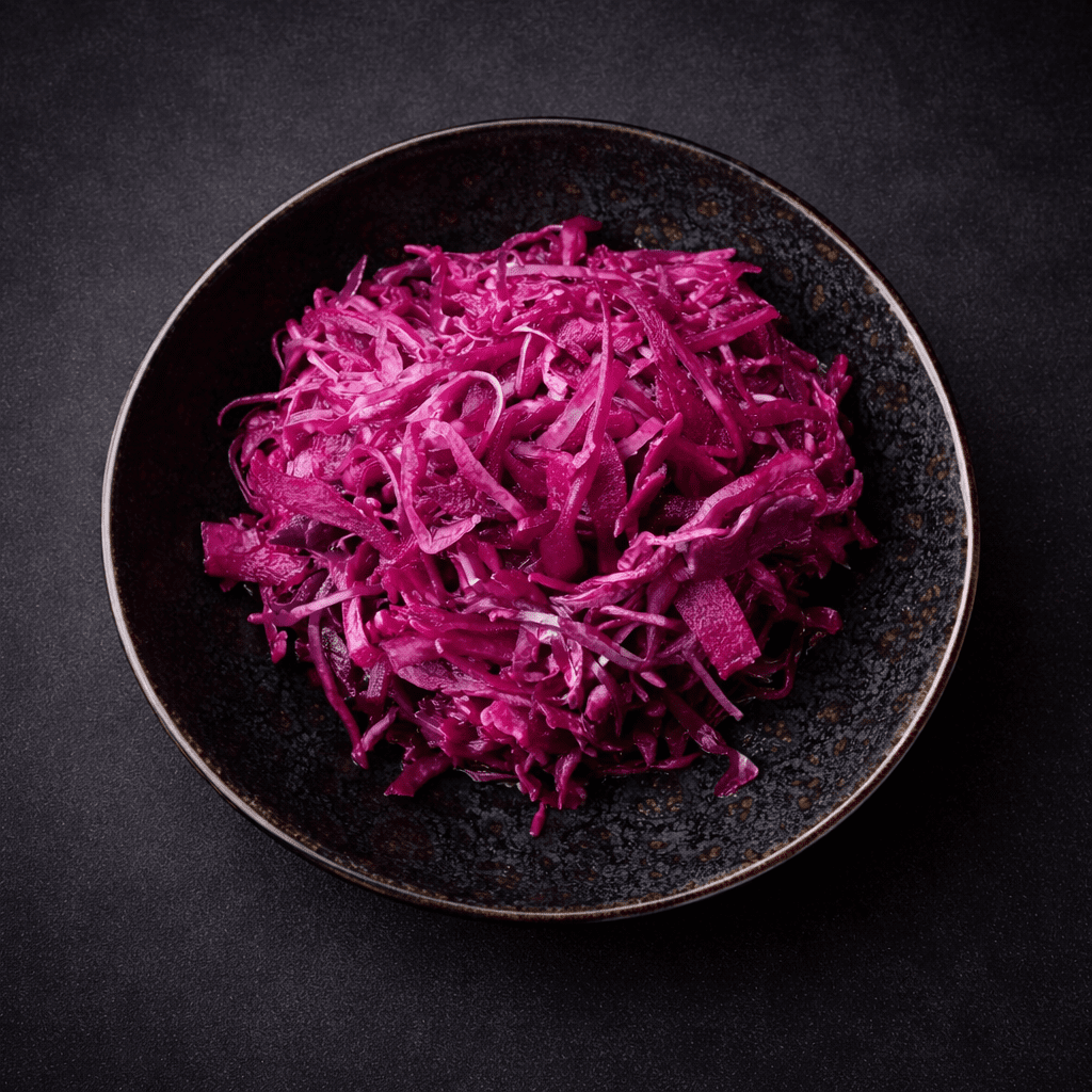 Frisse knapperige Atjar Merah van rode kool met een heerlijke zoetzure dressing. Op smaak gebracht met gember, azijn en suiker. Heerlijk als bijgerecht bij Nasi Goreng of Bami Goreng. Met zijn prachtige dieprode kleur maakt Atjar Merah van ieder bord een plaatje.