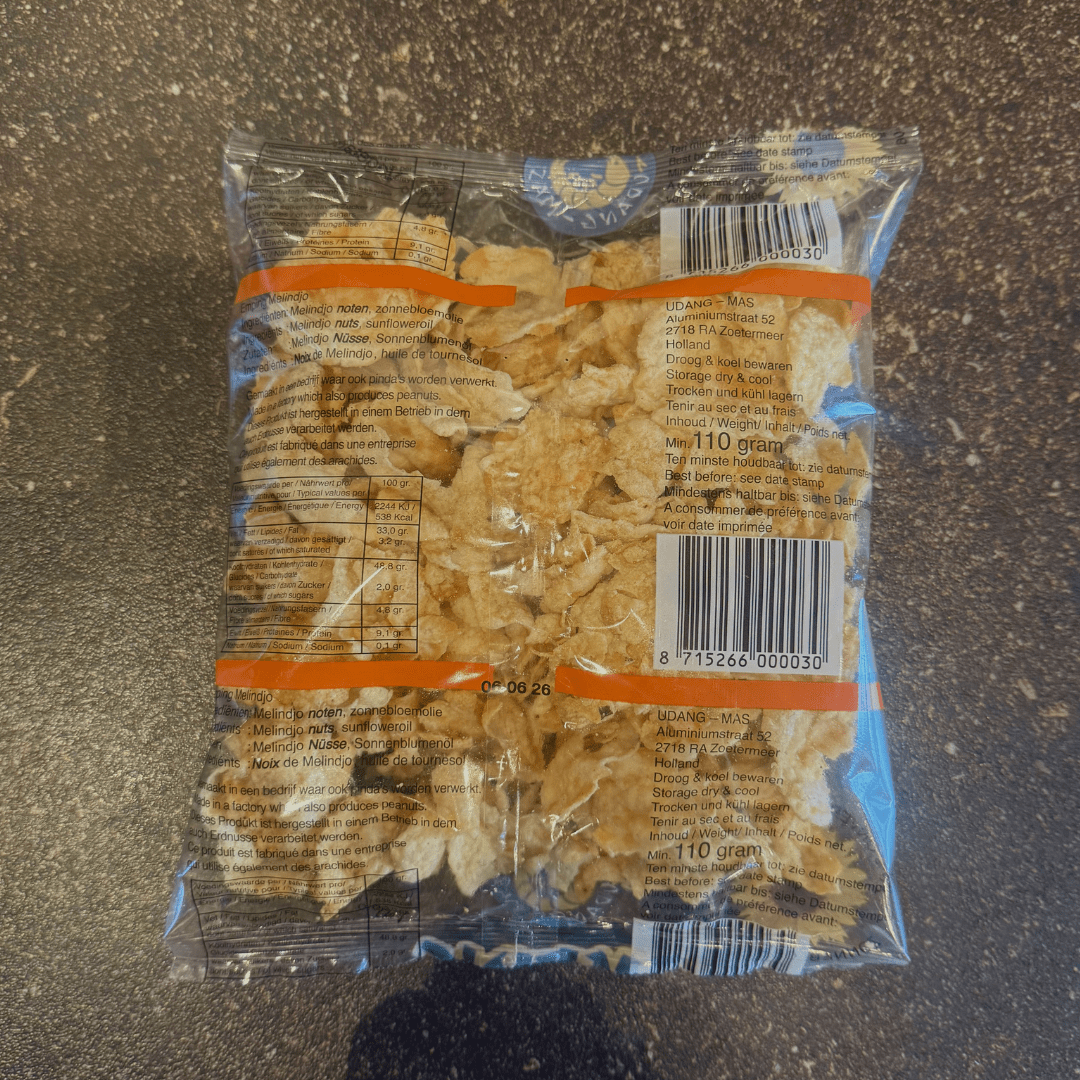 Knapperige emping van melindjo-noten, precies zoals onze tantes ze maken. Perfect als bijgerecht of snack bij je Molukse maaltijd.