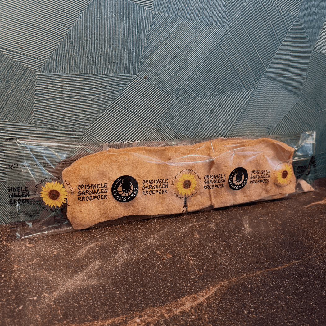 Onze Orginele Garnalen Krupuk wordt gemaakt volgens het traditionele recept van onze tantes, met echte garnalen en geen kunstmatige smaakmakers. Je proeft echt het verschil in authenticiteit.